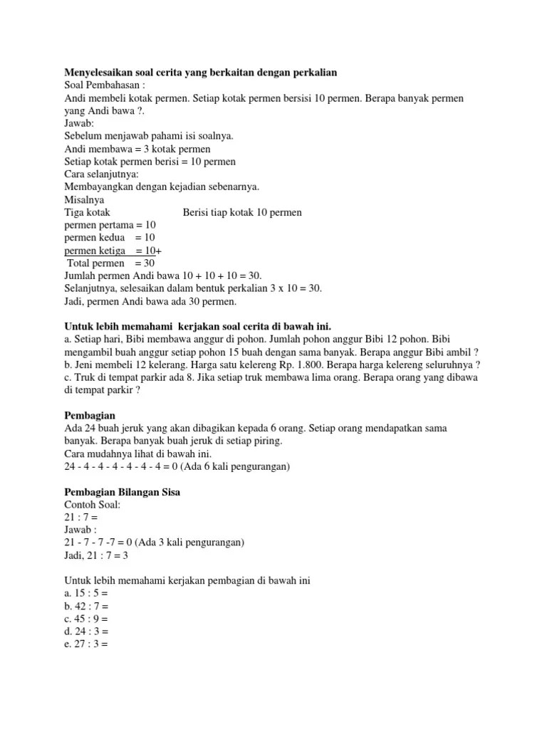 Buatlah soal cerita dari 1.pengurangan dan penjumlahan 2.perkalian dan pembagian 3.campuran · jawaban · sedang mencari solusi jawaban matematika .